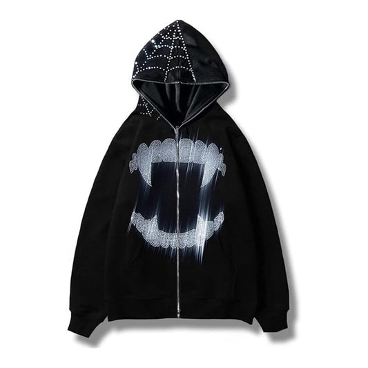 Punk Streetwear Full Zip Rhinestone Hoodie