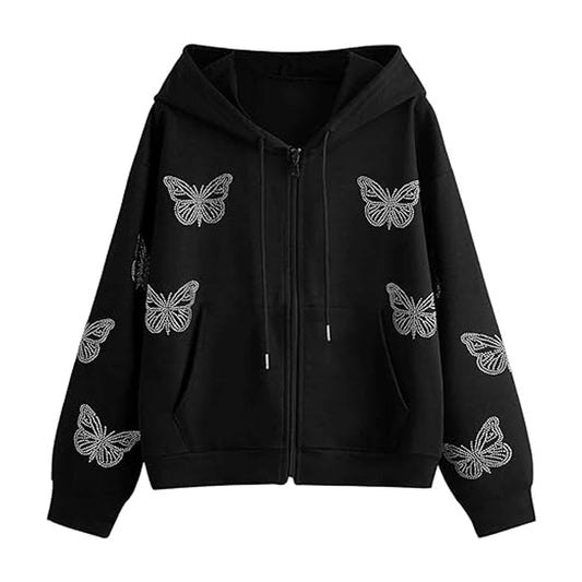 Women's Casual Butterfly Drawstring Rhinestone Hoodie