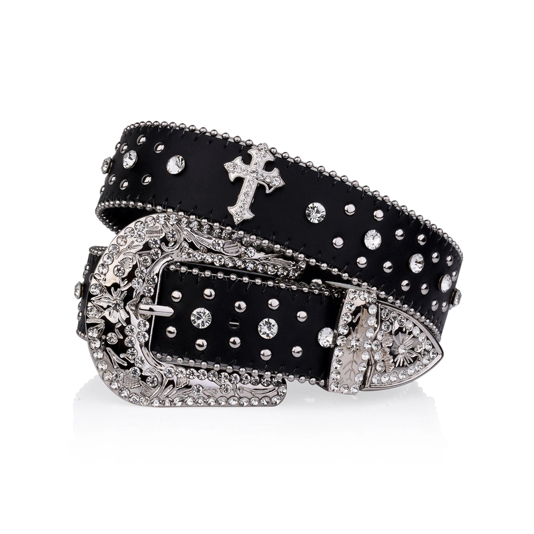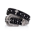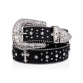 Engraved Buckle Cross Black Strap With Crystal Studded Rhinestone Belt