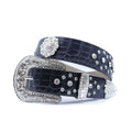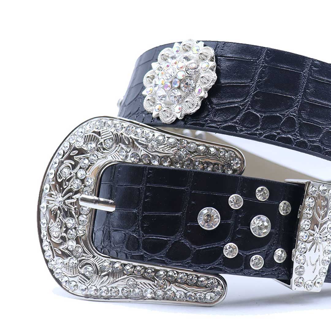 Engraved Buckle Flower Black Strap With Crystal Studded Rhinestone Belt