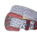 Red Rhinestone Belt With Grey Textured Strap and Skull Buckles