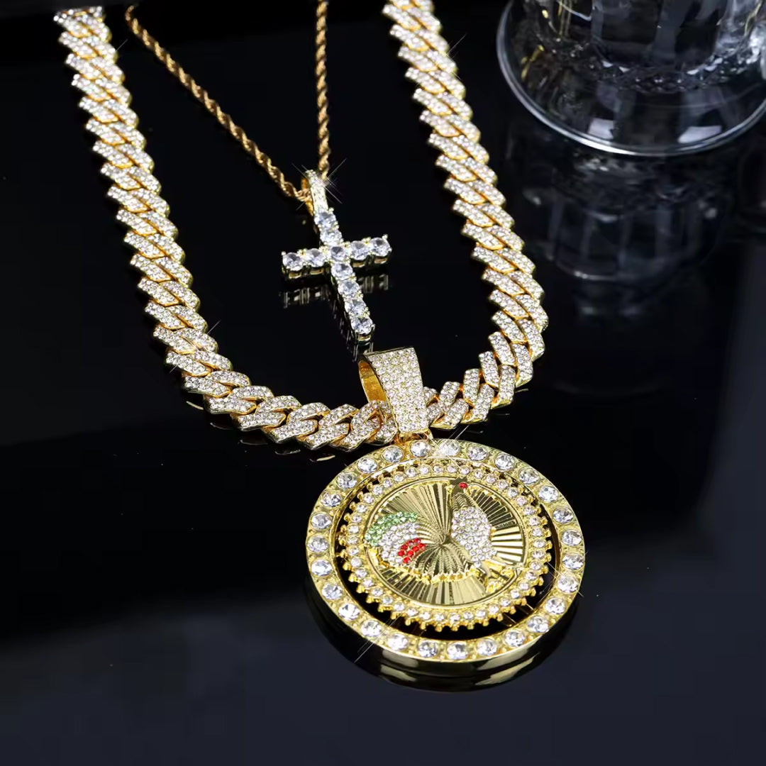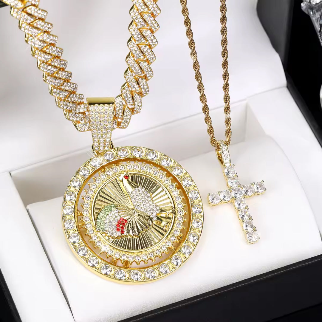 Make a bold fashion statement with this Shiny Round Cock Cross Pendant Necklace. Combining sparkling rhinestones with religious symbolism, this iced-out chain creates a stunning accessory that adds elegance and flair to any outfit. Whether you're looking to show your faith or simply enhance your style, this unique pendant delivers the perfect balance of spirituality and fashion.