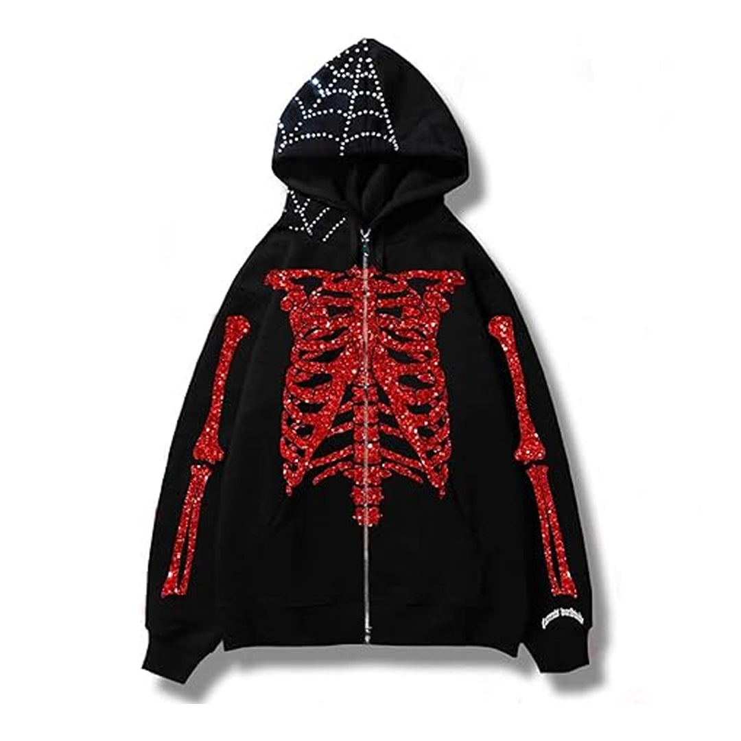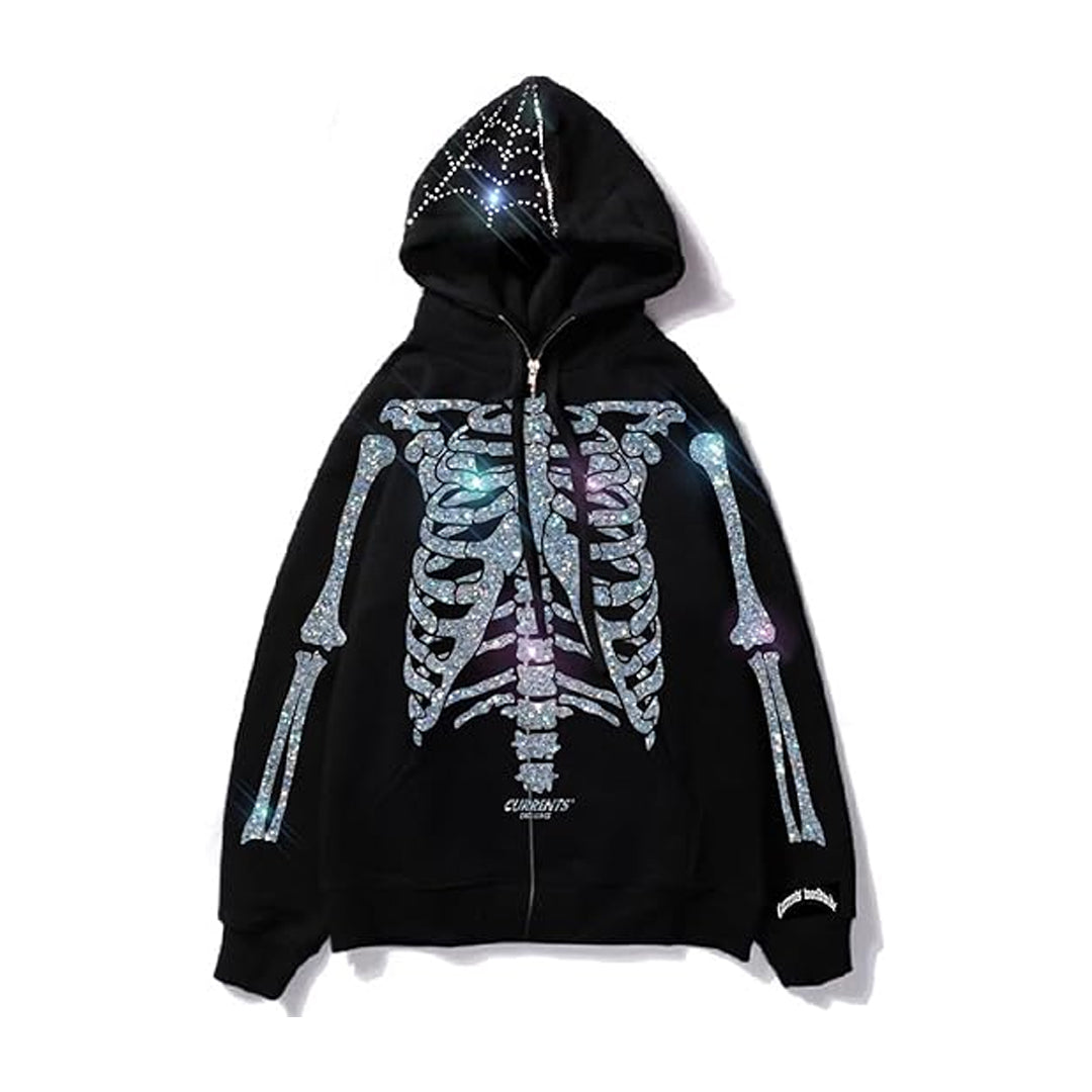 Get ready to slay this Halloween with our Skeleton Zip Up Rhinestone Hoodie, the ultimate blend of spooky and stylish. Crafted with meticulous attention to detail, this hoodie features a striking skeleton design embellished with sparkling rhinestones, adding a touch of glamour to your eerie ensemble. With its full zip-up closure, it offers convenience and versatility for all your haunting adventures. Whether you're trick-or-treating or attending a Halloween bash, this hoodie is sure to make you the life of the party. Embrace the spirit of the season in style with our Skeleton Zip Up Halloween Rhinestone Hoodie, your go-to choice for a spine-chillingly chic look.